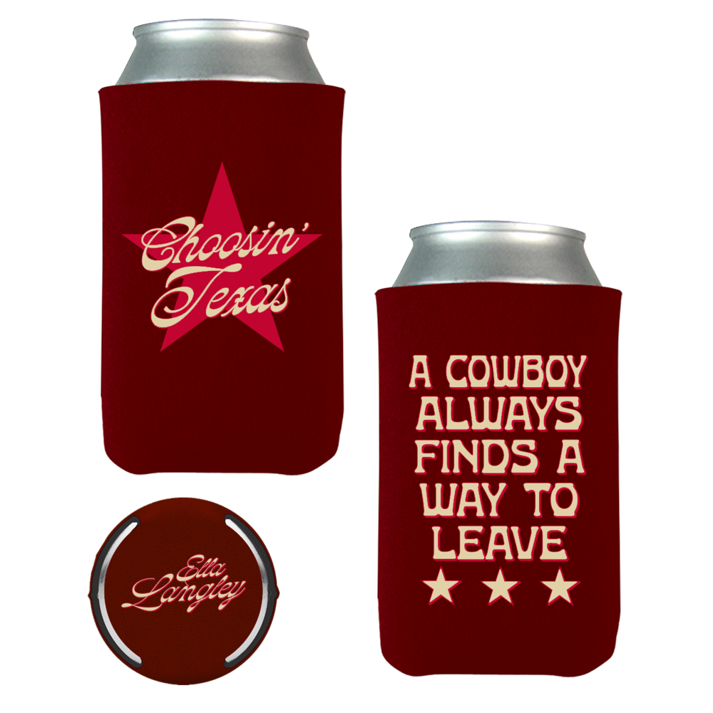 Maroon coozie with Choosin' Texas on one side and song lyrics, A Cowboy Always Finds A Way To Leave on the other.